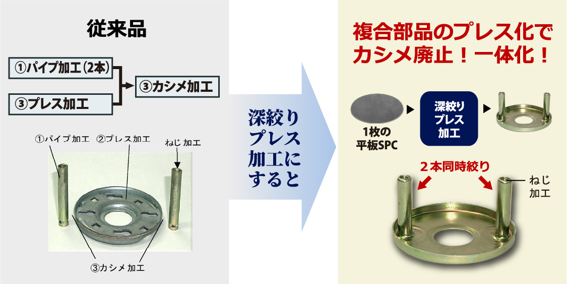 ・切削、ロウ付け、溶接等の複数工程を深絞りプレス 加工による工法転換で一発加工・コスト削減、工数削減、CO2削減等をに貢献