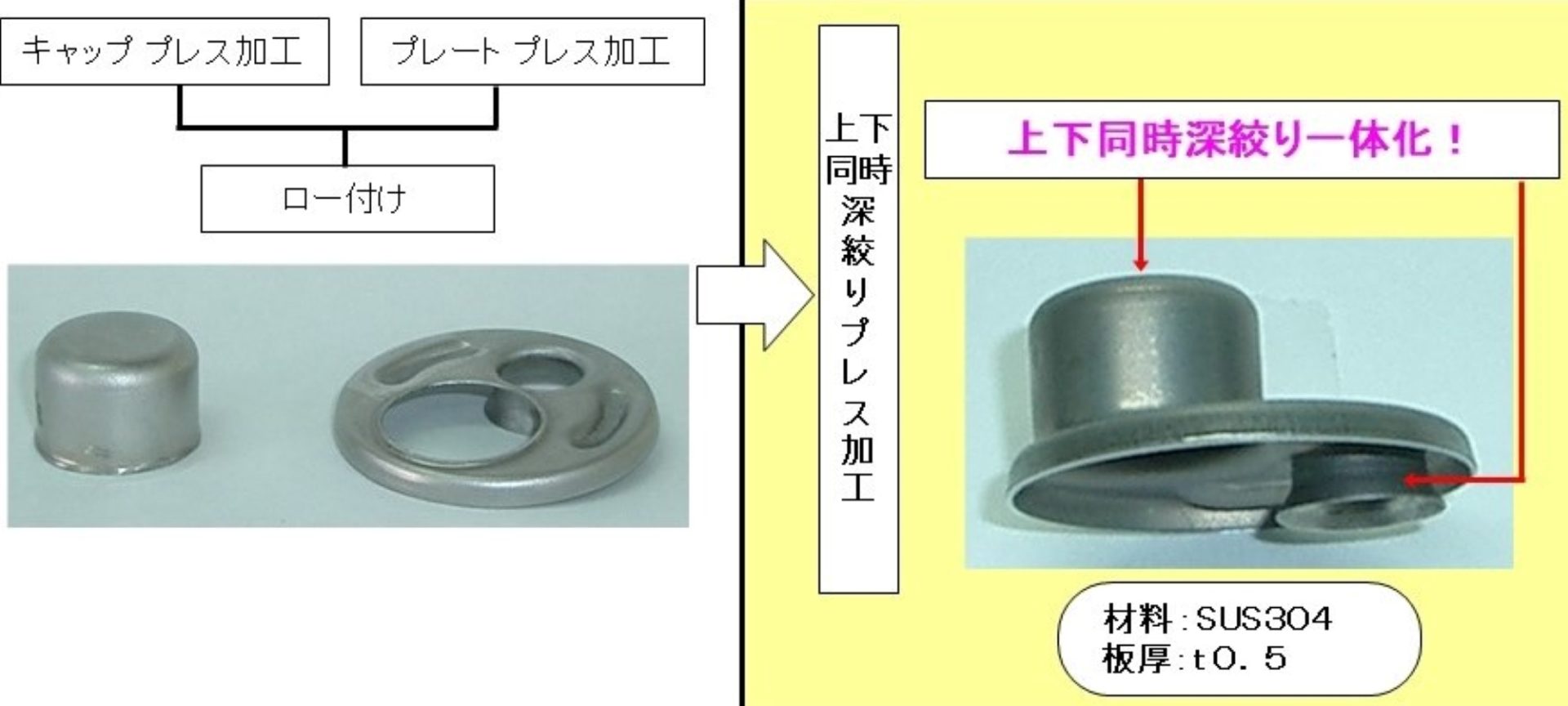 ・深絞りプレス加工による上下同時絞りによる工法転換で、ロウ付け加工廃止・コスト削減、工数削減、CO2削減に貢献